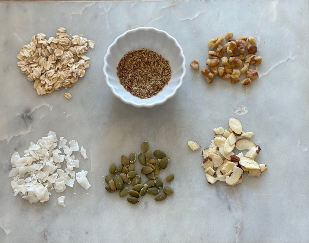 Homemade Granola: A combination of a variety of nuts (pecans, walnuts, almonds, pine nuts ) and seeds (pumpkin, sunflower, chia, sesame) can be used along with old fashioned oats and unsweetened coconut.